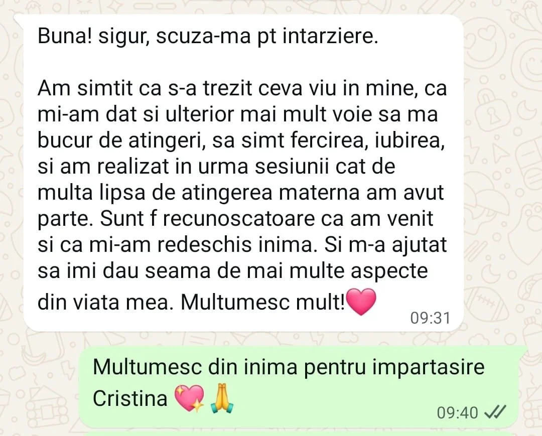 Am simțit că s-a trezit ceva viu în mine, că mi-am dat și ulterior mai mult voie să mă bucur de atingeri, să simt fericirea, iubirea, și am realizat în urma sesiunii cât de multă lipsă de atingere maternă am avut parte. Sunt f recunoscătoare că am venit și că mi-am redeschis inima. Și m-a ajutat să îmi dau seama de mai multe aspecte din viața mea. Mulțumesc mult!”