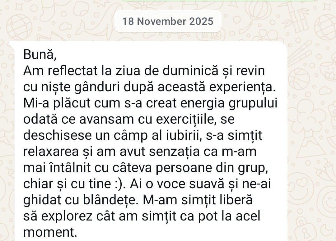 Mi-a plăcut cum s-a creat energia grupului odată ce avansam cu exercițiile, se deschisese un câmp al iubirii, s-a simțit relaxarea și am avut senzația că m-am mai întâlnit cu câteva persoane din grup, chiar și cu tine :). Ai o voce suavă și ne-ai ghidat cu blândețe. M-am simțit liberă să explorez cât am simțit că pot în acel moment.”