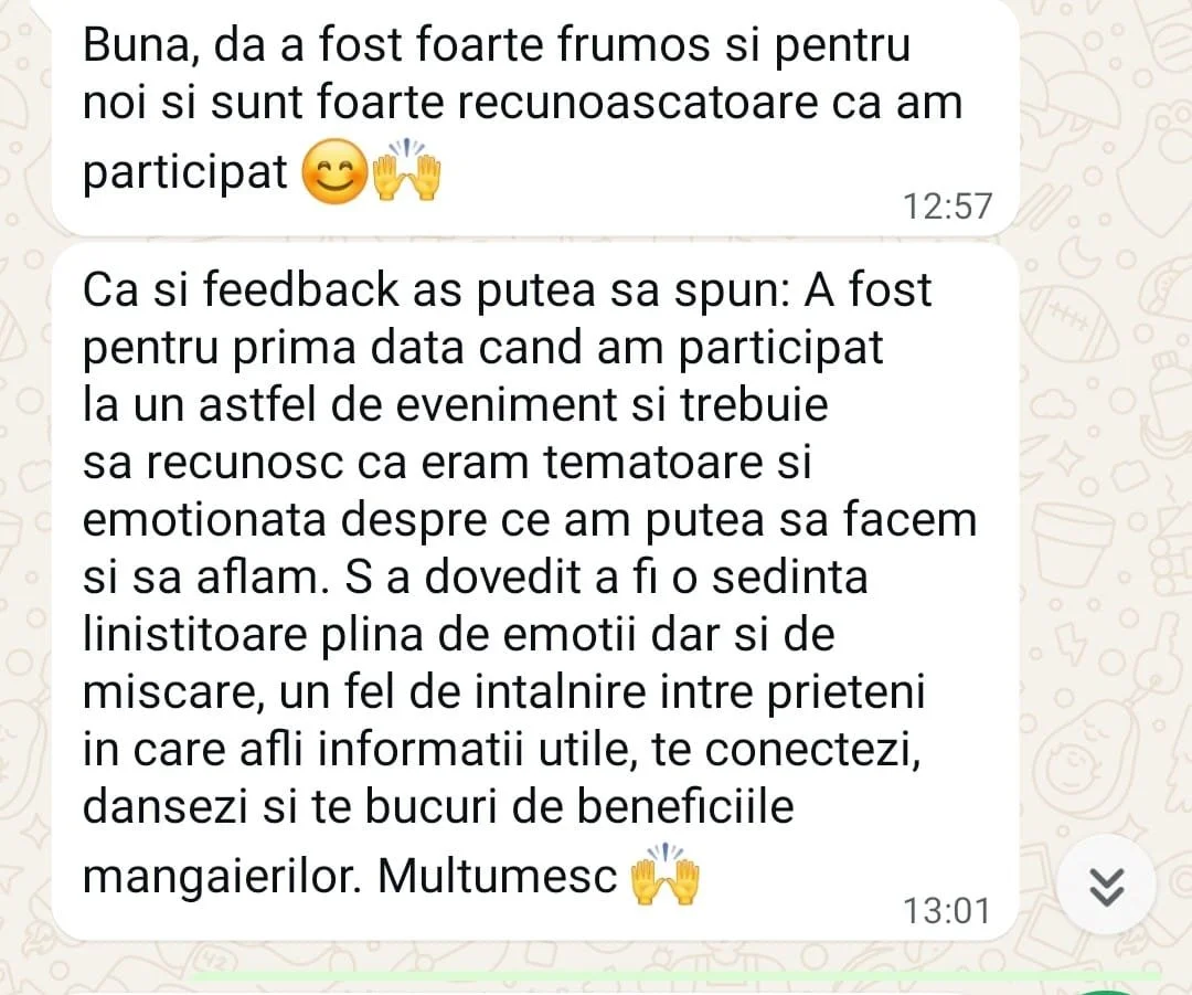 Ca și feedback, aș putea să spun: A fost pentru prima dată când am participat la un astfel de eveniment și trebuie să recunosc că eram temătoare și emoționată despre ce am putea să facem și să aflăm. S-a dovedit a fi o ședință liniștitoare, plină de emoții, dar și de mișcare, un fel de întâlnire între prieteni în care afli informații utile, te conectezi, dansezi și te bucuri de beneficiile mângâierilor. Mulțumesc 🙌.”