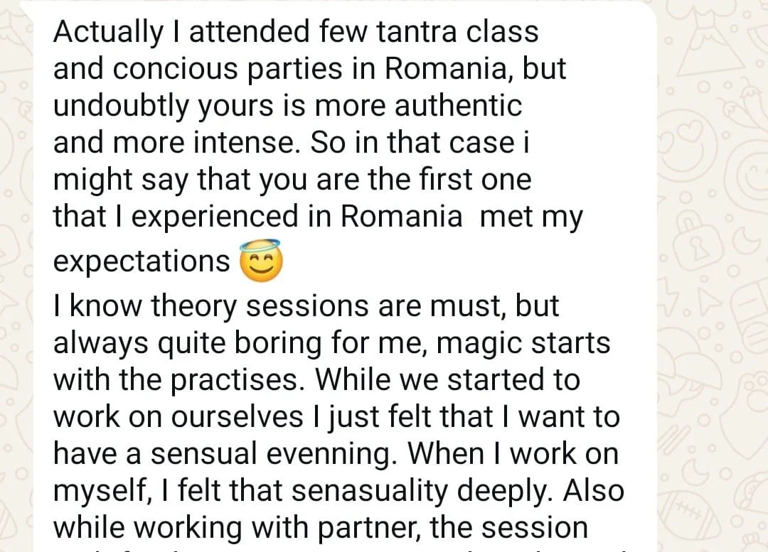 — cateva testimoniale primite prin Whatsapp“Actually, I attended a few tantra classes and conscious parties in Romania, but undoubtedly yours is more authentic and more intense. So, in that case, I might say that you are the first one that I experienced in Romania who met my expectations. 😇