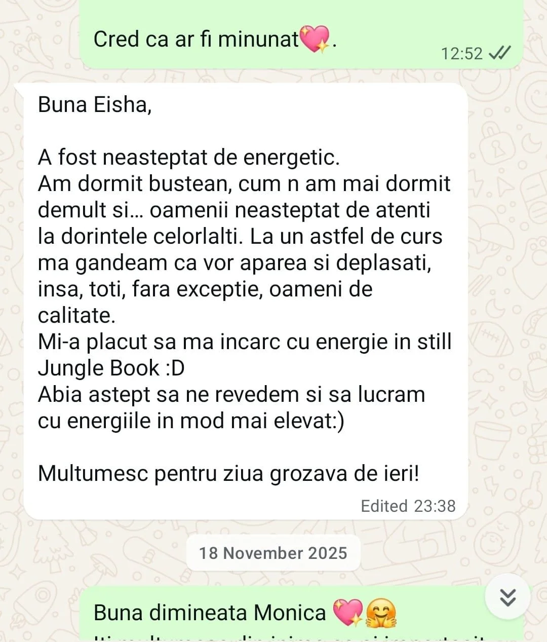 Abia aștept să ne revedem și să lucrăm cu energiile în mod mai elevat :) Mulțumesc pentru ziua grozavă de ieri!”